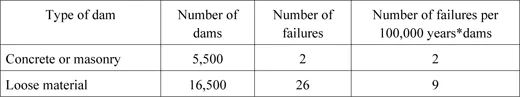 The dams are either built of natural materials without using any binder (backfill) or of materials that are reinforced using hydraulic binders (i.e. lime in the first gravity dams that were built using masonry, and then cement, fly ash, or slag cement in the case of concrete dams). The statistical data gathered by the International Commission on Large Dams (1995), presented in Table 1.1, emphasizes the fact that backfill dams make for more vulnerable structures than concrete or masonry dams. However, this table does not include the more fragile backfill dams that make up the flood-protection dikes whose failures hit the headlines during large floods.