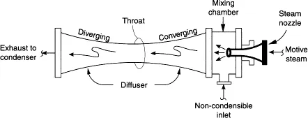 As the high velocity steam enters the inlet of the diffuser, shown in Figure 1.1, it starts to compress the non-condensable vapor drawn into the mixing chamber. I have read in some books, that the motive steam “entrains” the non-condensibles. This is wrong. The non-condensible gas flows into the mixing chamber for the same reason that any gas flows into the suction of any compressor. It flows towards the inlet of the diffuser because gas flows from an area of higher pressure to an area of lower pressure.