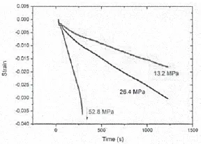 Figure 2 shows examples of typical traces of strain versus time. The initial creep rate tends to be high (primary creep), followed by a stable, slower, steady state creep rate (secondary creep) until the material starts to fail and the creep rate enhances again as can be seen for example in the trace for 52.8 MPa in Figure 2. Hence, to calculate the strain rate, the initial higher strain rate is ignored and the slope of the linear section is determined. These steady state strain rates have been plotted against stress for the mullite-zirconia composite in Figure 3. Over the limited range of stresses tested, the creep rate is related to the stress in the usual manner through: