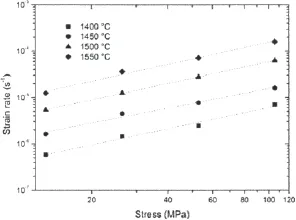 is the strain rate, A is a pre-exponential constant, σ is the stress and n the stress exponent. The fact that most lines are parallel, indicates that the stress exponent varies little. As shown in Table 2, this is indeed the case with the stress exponent close to 1 for most temperatures. It is worth pointing out that it is clear from Figure 3 that even at 1300 and 1350 °C the stress exponent would have been closer to 1 had the data point at 52.8 MPa not been included in the analysis.