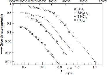 As can be seen, the lowest growth rates at a given temperature are for the silicon tetrachloride reaction (Eq. 1.2), because this molecule is the most stable of the four silicon precursors. The highest growth rates are seen for the silane reaction (Eq. 1), as this molecule is the least stable of the four. At the higher temperatures, to the left in the Figure, single crystal (epitaxial films) can be grown. At the lower temperatures, to the right, one obtains either amorphous or polycrystalline films.