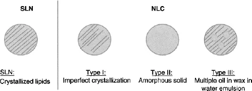 - Nanostructured Lipid Carriers (NLC) were introduced as a compromise. Composed of a mixture of liquid and solid lipids, the NLC core presents an imperfect crystallization which favors better encapsulation ratio thanks to lower crystallinity, while allowing control over release kinetics through the solid character of the lipid phase [15]. Three different types of NLC have been proposed (Figure 1.1): 1) the imperfect type, whose crystallinity is lowered by creating imperfections in the crystal lattices; 2) the structureless type, which is solid but amorphous; and 3) the multiple O/F/W type, in which small droplets of liquid lipids are phase separated in the solid matrix [16]. Although these 3 types can theoretically be obtained, the mixture of spatially incompatible lipids generally leads to the obtainment of the first type NLC [17, 18]. Several studies have reported the obtainment of the forms II and III, however, there is discrepancy in the conclusions. Some authors thus account for supercooled melt rather than amorphous solid particles concerning the structureless type [15, 19, 20]. Similarly, the same system was described as a typical multiple oil in fat in water type (O/F/W) [21], while a complete demixing of oil from wax occurs in the so-called “nanospoon structure” [22–24].