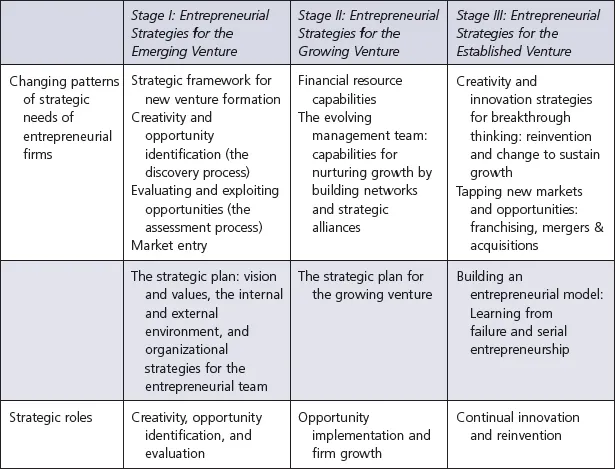Our book is written from the point of view of the founder or the entrepreneurial team. Increasingly, entrepreneurs are relying on the expertise and input of key stakeholders as they launch and develop their businesses. Whether these stakeholders are outside the firm in the role of advisers or inside in the roles of investors and employees, the entrepreneur’s ability to create a powerful team capable of breakthrough thinking shapes the new venture’s potential success and growth. This book strongly emphasizes the key strategic roles of creativity, opportunity identification, opportunity evaluation and implementation, and continual innovation in the emergence and growth of entrepreneurial firms. Table 1.1 displays these strategic roles, along with the changing patterns and needs of the entrepreneurial firm and the overall strategy and planning initiatives needed to take the firm to the next stage of growth.