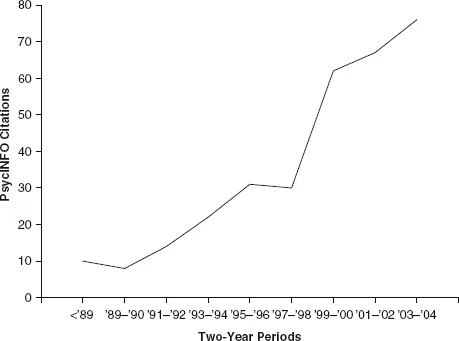 But the landscape is changing. The past decade has seen an explosion of experimental research on prospective memory (Kvavilashvili & Ellis, 1996). From 1996 to 2000, approximately 135 published papers appeared, and in the subsequent 5-year span (from 2001 to 2005) over 150 additional studies on prospective memory were published (Kvavilashvili, Kyle, & Messer, in press). As demonstrated in Figure 1.1, citation counts of prospective memory research have shown a parallel upswing. Laboratory paradigms for careful investigation of prospective memory have been developed, papers on prospective memory are appearing regularly in the journals, and important theoretical perspectives are being developed. Researchers from around the world are involved in prospective memory research. Since 2000, there have been two international conferences focused on prospective memory as well as many more-general cognition conferences that have included sessions on prospective memory. Students in many areas of psychology are expressing interest in prospective memory and conducting theses on the topic. Courses on prospective memory are being included in the curriculum in graduate programs. Prospective memory considerations are now included in government-sponsored efforts concerned with such things as aviation safety and space exploration. Although once appropriately characterized as a âforgottenâ topic (Harris, 1984), prospective memory is clearly a vibrant topic at the beginning of the 21st century. The primary literature is now sufficient to allow an informed and broad examination of prospective memory, and this book is intended to provide interested researchers and students with an accessible and integrated foundation for the scientific study of prospective memory.