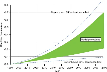 The Intergovernmental Panel on Climate Change (IPPC), made up of hundreds of scientists from 113 countries, reached a consensus in 2007 that, based on new research concluded in the last decade, it is 90 per cent certain that human-generated greenhouse gases account for most of the global rise in temperatures. The IPPC was very specific, predicting that, even under the most conservative scenario, the global increase of temperature will be between 1.1 C and 6.4 C by 2100, and the sea level will rise between 18 cm and 58 cm during that same time period (Collins et al., 2007; IPCC, WMO/UNEP, 2007).
