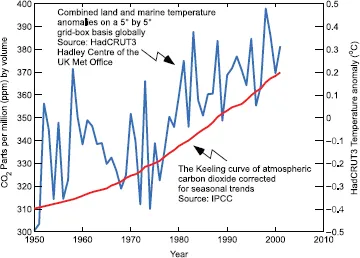 The Earth has warmed consistently and unusually over the past few decades in a manner that can be explained only when a greenhouse process is overlaid on orbital variation, solar variation, volcanic eruptions and other natural disturbances. Observational evidence, complex modelling and simple physics all confirm this. Whatever the proportion of human-induced rise in global temperature versus natural rise, there is no doubt that the temperature and the sea level are rising, the Greenland and Antarctic ice sheets are disintegrating, and major weather patterns and ocean currents are shifting (Figs. 1.1 and 1.2.). The Earth’s warming is already causing severe droughts and flooding, major vegetation transformations in deserts and forests, massive tundra methane releases and the degradation of the Amazon rainforest and Saharan vegetation (Gates, 1993). It is also starting to impact the Indian Ocean Monsoon, the Atlantic Conveyor Belt and El Niño weather patterns. The economic impacts of droughts in the USA alone cause $68 billion in losses per year (Chagnon, 2000).