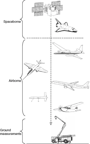 Remote sensing is primarily concerned with collecting and interpreting information about an object or landscape from a remote vantage point. The platform can be anywhere, ranging from a balloon just above the surface of the Earth to a satellite hundreds of kilometres away in space (Figure 2.1). Examples of remote sensing include aerial photography, satellite imagery, radar altimetry and laser bathymetry. Coupled with ground measurements, remote sensing can provide valuable information about the surface of the land, the oceans and the atmosphere.