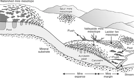 Lindsay (1995: 22) notes that âmire complexes are most frequently encountered in the uplands where several hydro-topographical units ⌠fuse to form an extensive complex cloaking the landscape with peat.â To understand what Lindsay means by hydro-topographical units it is necessary to first review the basic classification of peatland landforms produced by Russian peatland scientists and summarized in Ivanov (1981) (Table 1.2). In the context of upland peatlands the macrotope is the upland mire complex identified above and the mesotopes which combine to form this macrotope might reasonably be characterized as any of the mire types identified by Hughes and Heathwaite (1995a). The mesotope therefore is essentially a unit at the scale of peat landforms and the macrotope describes the peatland landscape. In a sense the geomorphology of a landscape where peat formation occurs is the prime control over the mire type produced since local slope is the major determinant of the direction of groundwater flow relative to the centre of mire growth and consequently of the division between fens and bogs. Lindsay (1995) uses an explicitly geomorphological framework to subdivide elements of the blanket bog type following Ivanovâs (1981) assertion that mire classification should include a geomorphological element. Lindsay describes watershed mires (probably better defined as summit mires), spur mires, saddle mires and valley side mires defined by their topographical setting. These hydro-topographical units are essentially mire mesotopes classified geomorphologically. Figure 1.2 illustrates the combination of a series of these hydro-topographical units to form an upland mire complex (macrotope).