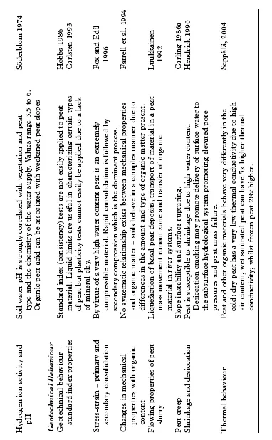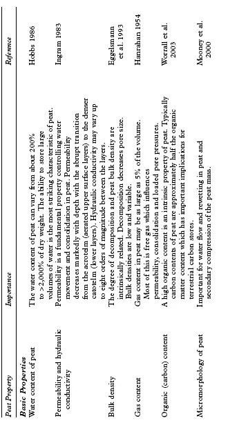 Table 1.1 Key properties of peat and examples of the importance of these for peatland geomorphic processes. This is not a comprehensive survey. It is included to demonstrate the important link between the peat material properties and controls on surficial processes
