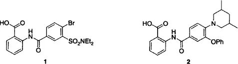 Bacterial proteins are an ideal starting point for SBDD, as in the case of the β-ketoacyl carrier protein synthase III (FabH), the target for a recent SBDD-based approach (Nie et al., 2005). FabH catalyzes the initiation of fatty acid biosynthesis, and a combination of X-ray data along with structures of substrates and known inhibitors led to selection of a screening library to provide a starting point for one recent study. Following screening, co-crystallization of selected inhibitors then guided the addition of functionality to take advantage of interactions with the enzyme visualized by X-ray and docking studies. A 50-fold improvement in enzyme inhibitory potency was realized in going from structure 1 to 2, accounted for by amino acid side-chain movements revealed by X-ray co-crystal structures of both compounds with the enzyme. Although much remains to be learned so that these side-chain movements can be predicted and exploited for new compound design, the study nonetheless provides a successful example of the implementation of SBDD in drug design.