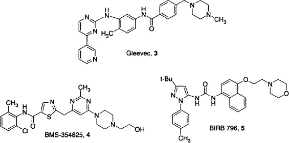 Although human proteins are more challenging to obtain in sufficient quantity for crystallization, modeling based on X-ray crystal structures has been successfully applied to many human targets. Probably the best-known efforts have been in the kinase area in search of anticancer drugs, which has been reviewed recently (Ghosh et al., 2001). For example. X-ray crystallographic data revealed important aspects of the binding of the anticancer drug Gleevec (3) to its target, the Bcr-Abl kinase, including the role of the pendant piperazine group, added originally to improve solubility, and the requirement for binding to an inactive conformation of the enzyme (Schindler et al., 2000). Combined with studies of the mutations responsible for Gleevec-resistant variants of Bcr-Abl, these studies enabled design of a new compound, BMS-354825 (4), active against most of these resistant mutants (Shah et al., 2004). More recently, non-ATP binding site inhibitors have been discovered and modeled by SBDD. For example, SBDD helped to characterize a new class of p38 kinase inhibitors that bind to a previously unobserved conformation of the enzyme that is incompatible with ATP binding (Pargellis et al., 2002). Insights from SBDD then guided design of a picomolar p38 kinase inhibitor based on binding to this site, BIRB 796 (5).