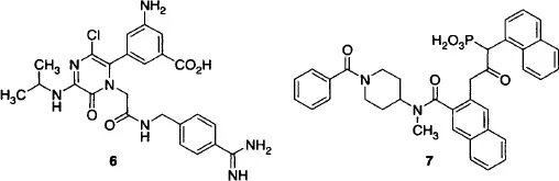 SBDD approaches to other soluble proteins have produced inhibitors of the tissue factor Vila complex (Parlow et al., 2003) and cathepsin G (Greco et al., 2002). In the case of factor Vila inhibitors, X-ray data provided information for both designing a new scaffold for inhibitors and for simultaneously improving binding affinity and selectivity over thrombin. Compound 6 from this work was advanced to clinical trials based on its potency and selectivity for factor Vila inhibition. The cathepsin G inhibitor program revealed a novel binding mode for an alpha-keto phosphonate to the enzymeās oxyanion hole and active site lysine, as well as an opportunity to extend groups into a vacant binding site to improve potency. The result was a nearly 100-fold increase in inhibition following an SAR study of this direction using the amide group in compound 7.
