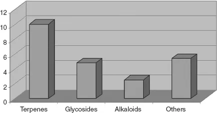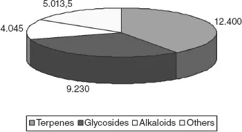 Besides venoms, toxins, and antibiotic peptides from animals (frogs, spider, snake etc.), a new focus is nowadays on the marine world (e.g., curacin A with antitumor activity from marine cyano bacteria). The use of micro-organisms is already well-established in industrial fermentation [10]. Alternative to this, extracts from plant tissue are a rich source of lead compounds for nutraceutical or pharmaceutical applications [11,12]. The market alone for herbs for nutritional supplements, for example, green tea, melissa, blueberry, is about 6.7 billion euros in Europe and 17.5 billion worldwide. In respect to this, the average trading volume of medicinal plant raw material is, according to FAO, 1 billion US$, and was 440 million US$ in USA in 1997. The annual growth rates for nutraceuticals and pharmaceuticals derived by industrial product extraction is about 6 to 8% (see Table 1.1) [13]. Here triterpenes have the highest growth rates (Figure 1.3). In 2002 the world market for pharmaceuticals from natural plants was estimated to be 30.7 billion US$, and the share of triterpenes is given in Figure 1.4 and the market in Europe depicted in Figure 1.5 [14].