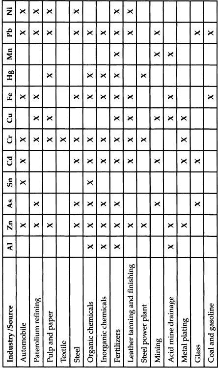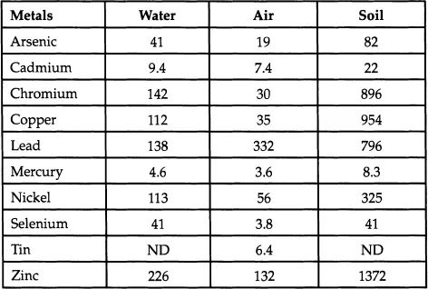 It is clear from Table 1.3 that invariably the metal content is highest in soil. Like other pollutants, metallic elements are also classified as essential and non-essential metals. Essential metals are an integral part of the diet, but non-essential metals also enter the environment and pose health problems. Due to widespread application of heavy metal in different industrial activities, higher concentrations of metallic pollutants are continuously being discharged in water bodies. The United States Environmental...