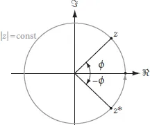 Here, |z| is the modulus of z with |z|2 = a2 + b2. ϕ is called the argument or the phase of z (Figure 1.2). It is ϕ = arg(z) = arctan(b/a). In turn, one obtains the Cartesian coordinates from the polar coordinates by a = |z| cos ϕ and b = |z| sin ϕ. By varying ϕ, z moves on a circle in the complex plane with a periodicity of 2π. Hence, there is an ambiguity in the polar representation: for a specific point in the complex plane described by the pair of coordinates (a,b), all polar coordinates of the form (r,ϕ + m2π) with m = 0, ±1, ±2, … also represent the same point. This 2π-phase ambiguity is an important aspect of all wave phenomena.