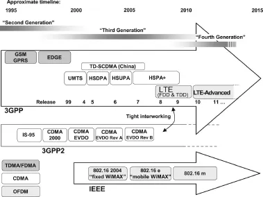 A second evolution track shown in Figure 1.1 is led by a partnership organization similar to 3GPP and known as 3GPP2. CDMA2000 was developed based on the American ‘IS-95’ standard, which was the first mobile cellular communication system to use CDMA technology; it was deployed mainly in the USA, Korea and Japan. Standardization in 3GPP2 has continued with parallel evolution tracks towards data-oriented systems (EV-DO), to a certain extent taking a similar path to the evolutions in 3GPP. It is important to note that LTE will provide tight interworking with systems developed by 3GPP2, which allows a smooth migration to LTE for operators who previously followed the 3GPP2 track.