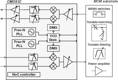 A schematic vision of what the final SDR will look like is represented in Fig. 1.1. For a low cost in a large-volume consumer market, the active transceiver core is implemented in a plain CMOS technology. It includes a fully reconfigurable direct-conversion receiver, transmitter, and two synthesizers [for frequency-domain duplex (FDD) operation]. The functions that cannot be implemented in CMOS are included on the package substrate. These are related primarily to the interface between the active core and the antenna. They must provide high-Q bandpass filtering or even duplexing, impedance-matching circuits, and power amplification. In the remainder of the chapter we focus primarily on the transceiver implementation.
