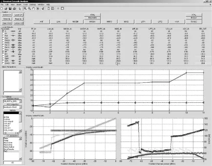 A custom MATLAB tool has been developed to do this exercise [1]. It takes in a netlist that describes all building blocks, with the performance characteristics and gain ranges, and simulates on a behavioral level the complete chain for a list of different test cases. Figure 1.2 shows a screenshot. The performance under all circumstances can thus be evaluated, and the building block performance can be tuned to fulfill all requirements. Gain ranges and signal filtering must be set such that the signal levels are an optimal trade-off between noise and distortion. Although being a difficult exercise, the analysis can show that with the built-in flexibility, a software-defined radio can achieve state-of-the-art performance very close to that of dedicated single-mode solutions. In the next sections we go deeper into the design of some crucial building blocks.