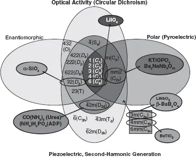 Materials that are crystallographically noncentrosymmetric (NCS), or acentric, are of current interest attributable to their functional properties, including piezoelectricity, ferroelectricity, and second-harmonic generation. Numerous relationships occur between these properties and crystal classes.[1] These relationships are shown in Figure 1.1, along with several well-known materials. It is instructive if we examine this figure more closely. If we examine the left-side of Figure 1.1, the symmetry dependent property we encounter is enantiomorphism, and the chiral crystal classes. All chiral materials must crystallise in one of eleven crystal classes, 1 (C1), 2 (C2), 3 (C3), 4 (C4), 6 (C6), 222 (D2), 32 (D3), 422 (D4), 622 (D6), 23 (T), or 432 (O). Materials found in any of these crystal classes have a āhandednessā, and a nonsuperimposable mirror image. The well-known chiral material α-SiO2[2, 3] crystallises in crystal class 32 (D3). If we examine the right-side of Figure 1.1, we encounter the ten polar crystal classes, 1 (C1), 2 (C2), 3 (C3), 4 (C4), 6 (C6), m (Cs), mm2 (C2v), 3m (C3v), 4mm (C4v), and 6mm (C6v). Materials found in these crystal classes have a permanent dipole moment. In fact LiIO3,[4, 5] which crystallises in crystal class 6 (C6) is both chiral and polar. The other materials shown: KTiOPO4 (KTP)[6] and Ba2NaNb5O15 (mm2 for both),[7] LiNbO3[8, 9] and β-BaB2O4 (3m for both),[10, 11] and BaTiO3 (4mm) are all āpurelyā polar. They all have a dipole moment, but are not chiral. Examples are also given of materials, CO(NH2)2 (urea)[12] and (NH4)H2PO4 (ammonium dihydrogen phosphate, ADP)[13] that crystallise in crystal class