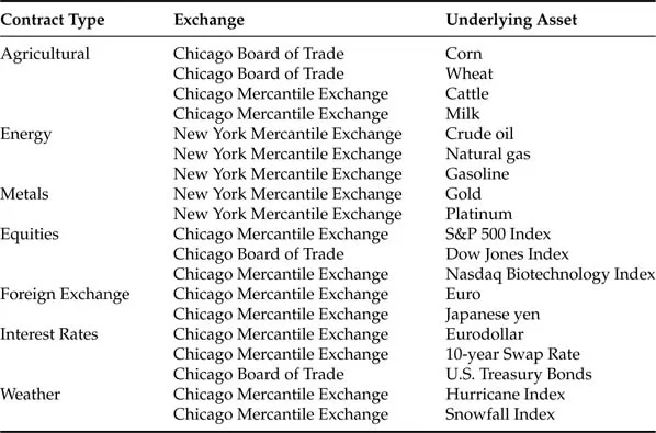 A key attribute of a financial risk is that it can be managed by entering into some form of contract that can be settled in cash. Classic forms of contracts with these characteristics include forward contracts privately arranged between two parties or futures contracts traded on exchanges located around the world. Exhibit 18.1 includes an overview of some of the types of contracts traded at several of the largest futures exchanges in the United States. As may be seen from the wide array of contract types and underlying assets, futures markets exist to manage risks as disparate as those arising from the stock market (i.e., S&P 500) to the amount of snowfall in Boston or New York City.