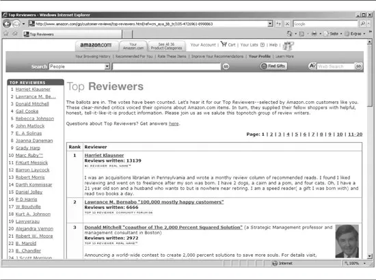 Ein anderes besonders deutliches Beispiel des Ungleichgewichts in der Beteiligung an Online-Community-Aktivitäten findet sich im Rezensionssystem von Amazon. Bei mehreren hundertausend Reviews von Lesern gibt es im deutschsprachigen Raum mehrere einzelne Beteiligte, die jeweils mehr als 1.000 Rezensionen geliefert haben (http://ama-zon.de/gp/customer-reviews/top-reviewers.html/). Der Spitzenreiter in den USA (eine ehemalige Büchereiangestellte) hat (zum Zeitpunkt der Recherche dieses Buches) mehr als 13.000 Rezensionen verfasst.