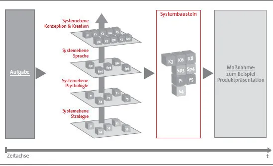 So können alle Register der Systemebenen und ihrer Module gezogen werden, um einen einzelnen Baustein zu bilden, als âStreckenbuchâ fĂŒr eine EinzelmaĂnahme, die in allen Details abgestimmt wird auf das Unternehmen, das Produkt, die Zielgruppe und weitere KommunikationsmaĂnahmen des Unternehmens. Die Zeitachse wĂŒrde sich, wenn man Vor- und Nachbereitungsphase aus der Betrachtung ausklammert, auf ein, zwei oder drei Tage beschrĂ€nken.