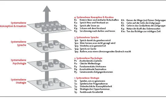 Das System KommunikationDirekt besteht aus vier Ebenen: Strategie, Psychologie, Sprache sowie Konzeption und Kreation. FĂŒr jede Ebene gibt es verhaltensleitende Module. Ein solches Modul lautet zum Beispiel âSprich alle Sinne anâ (K3). Dieses Verhaltensmuster wird durch Kommunikationsgesetze begrĂŒndet. In unserem Fall lautet ein solches Gesetz beispielsweise, dass Informationen desto besser behalten werden, je mehr Sinne angesprochen werden. Wir haben das in den Erfolgskomponenten gespeicherte Erfahrungswissen identifiziert, modifiziert, ergĂ€nzt und in einen neuen theoretischen Gesamtzusammenhang gebracht: