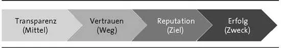 Die Probleme beginnen häufig schon mit der Frage, warum ein Unternehmen transparent sein möchte oder sein sollte. „Wir sind besonders transparent, weil Offenheit einer unserer sieben Werte ist“, argumentiert ein Unternehmen. Ein anderes: „Wir haben uns geöffnet, weil wir immer mehr Anfragen bekommen haben.“ Beide Beispiele sind Originalzitate, beide greifen zu kurz. Denn bei der Frage, ob ein Unternehmen zu bestimmten Themen Transparenz herstellen sollte oder ob nicht, darf nicht die Transparenz im Vordergrund stehen. Es geht im Kern dieser Fragestellungen nicht um Transparenz als Selbstzweck. Sondern darum, ob Transparenz ein probates Mittel ist, um Vertrauenskapital aufzubauen und darüber eine gewünschte Reputation für eine Marke oder ein Unternehmen zu erreichen. Die Kausalkette lautet wie folgt: Transparenz ist eine zunehmend wichtigere Dimension, um bei diversen Stakeholdergruppen Vertrauen zu schaffen. Vertrauen ist die Voraussetzung für eine kraftvolle Reputation, die wiederum einen messbaren Beitrag leisten muss zum Unternehmenserfolg. Nach der Clausewitzschen Strategiedefinition ist Transparenz das Mittel, Vertrauen der Weg, Reputation das Ziel und der unternehmerische Erfolg der Zweck.