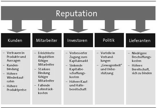 Jedes Unternehmen muss sich im Wettbewerb behaupten und nachhaltig profitabel wirtschaften. Eine gute Reputation hat dabei positive Auswirkungen auf allen zentralen Handlungsebenen und Märkten: dem Absatzmarkt, Personalmarkt, Lieferantenmarkt, Kapitalmarkt sowie Politik und Gesellschaft. Unter Reputation versteht man dabei die generelle Einschätzung eines Unternehmens durch die verschiedenen Stakeholder. Sie umfasst sowohl kognitive als auch emotionale Bestandteile. Wichtig dabei: Reputationsurteile basieren auf direkten Erfahrungen und auf verarbeiteten Kommunikationsbotschaften.7 Die positiven Effekte einer begehrenswerten Reputation sind in Theorie und Praxis vielfach beschrieben und dokumentiert worden.9 Viele Unternehmen gehen in ihren strategischen Planungen daher zu Recht davon aus, dass es eine direkte Korrelation gibt zwischen Unternehmensreputation und Rendite.