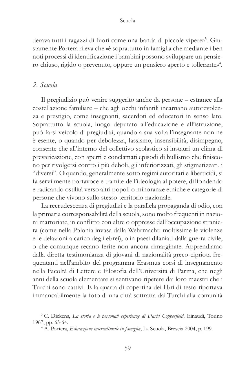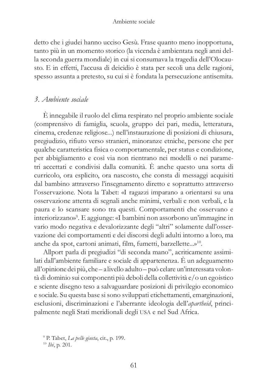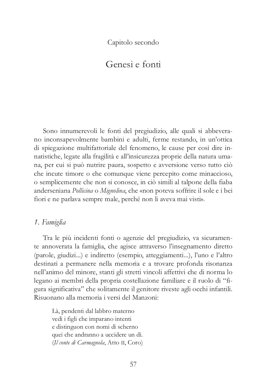 La ricerca, soprattutto psicologica e sociologica, ha focalizzato prevalentemente il pregiudizio etnico-razziale – drammaticamente presente in molte società, a cominciare da quella americana – e, più recentemente, anche quello di genere o "sessista". Il presente saggio, collocandosi in una prospettiva interdisciplinare, intende dilatare questa prospettiva, dedicando debita attenzione a tutte le forme e varietà di pregiudizio, con i connessi meccanismi di etichettamento, di stigmatizzazione e di esclusione, col supporto di ricche esemplificazioni tratte dalla storia, dalla cronaca, dall'autobiografia, dalla biografia, dalla letteratura, dal cinema e dai fumetti. Il pregiudizio – quale atteggiamento mentale non verificato né criticamente vigile – nella varietà dei suoi bersagli non si rivolge soltanto ed esclusivamente a esseri umani, ma può appuntarsi su una infinita varietà di soggetti e di oggetti. Conoscere il pregiudizio è il primo passo per distanziarsene.