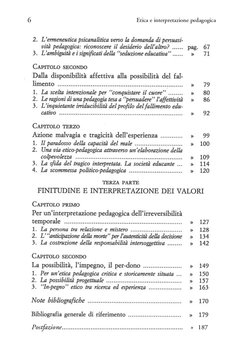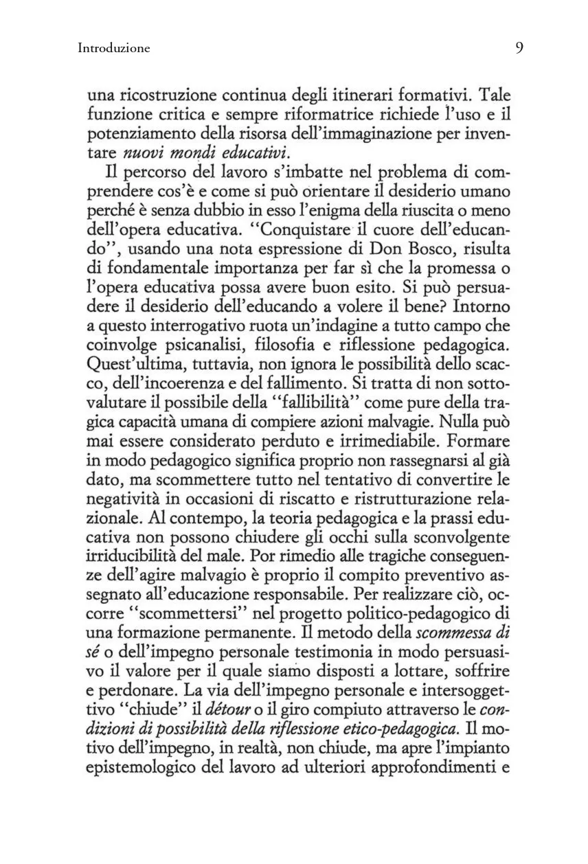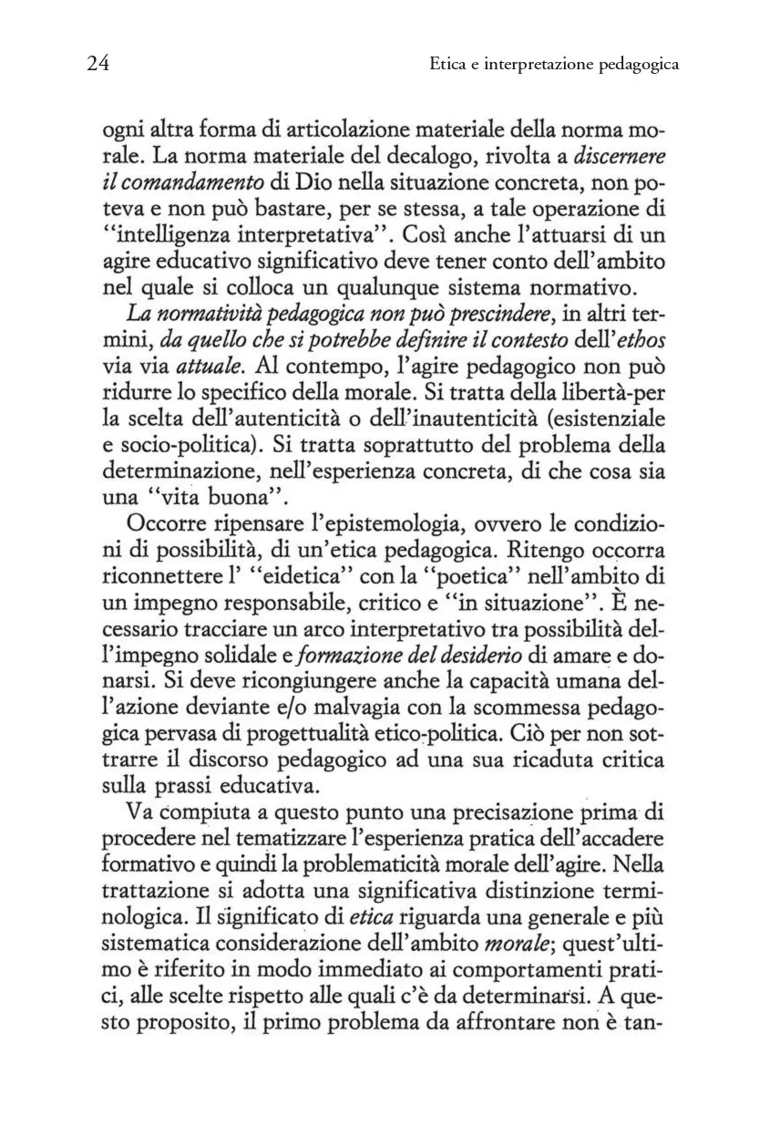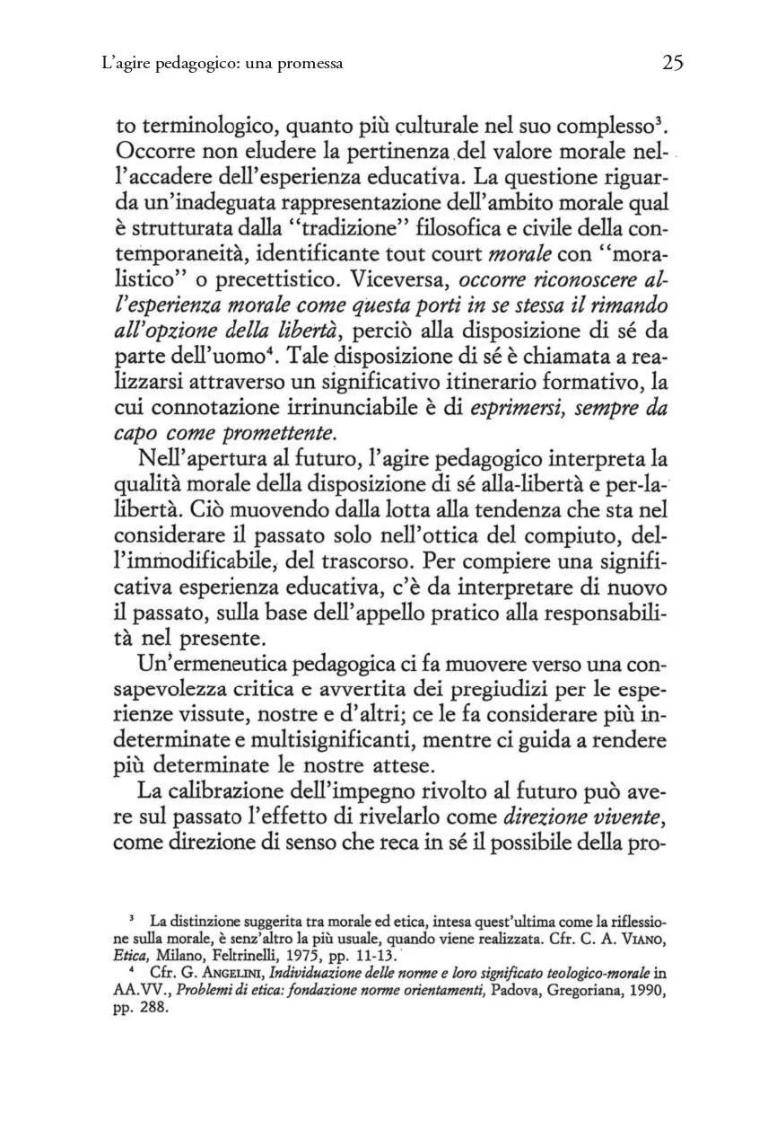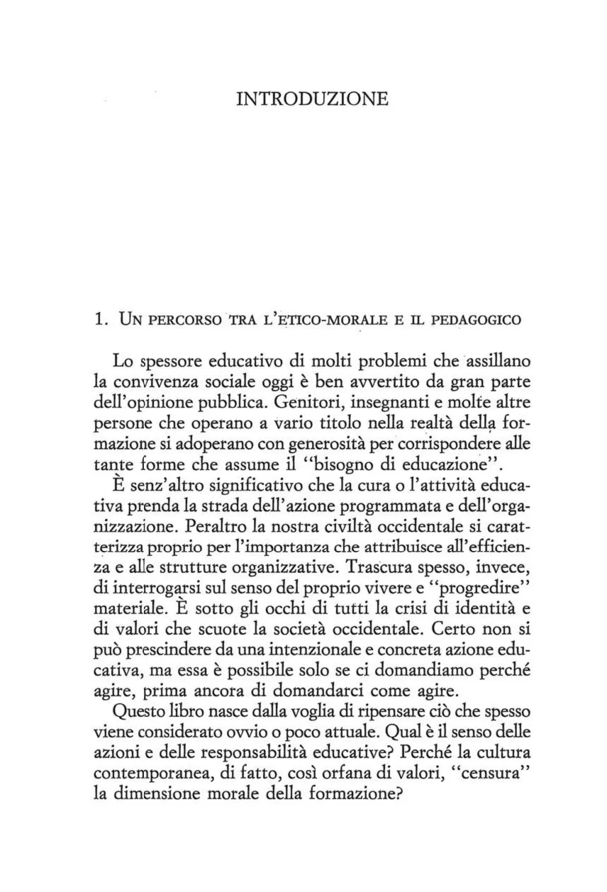 Il dibattito che s'è di recente riacceso intorno all'etica non trascura di toccare questioni legate all'educazione. Sta alla riflessione pedagogica interpretare la dimensione morale delle pratiche formative, coinvolgendo in tale impresa altri ambiti disciplinari, dall'ermeneutica filosofica a quella teologica e psicoanalitica. L'inadeguatezza del moralismo e le illusioni del permissivismo inducono a riconsiderare il significato profondo della responsabilità educativa. Nella complessità dei rapporti di relazione, a ciascuno di noi è chiesto di orientarsi in modo intenzionale alla "vita buona" con e per l'altro per costruire "istituzioni giuste". E' peculiare dell'azione pedagogica anticipare e promuovere la disponibilità intersoggettiva all'impegno formativo. Impegno e promessa cui l'educando può consentire o meno, nei quali anche l'educatore può "mancare". Promessa che chiama ad interrogarsi sul mistero della persona umana, col suo desiderio d'essere amata e al tempo stesso con la sua capacità di fallire l'esistenza. La consapevolezza e la disponibilità affettiva possono riconciliare la forza del desiderio con l'esigenza della norma? Si può persuadere a volere il bene? La tensione etico-morale attraversa la progettazione pedagogica, alla quale spetta il compito di porsi in ascolto dell'esperienza, così com'è, e di interpretarla.