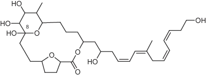 Type: Linear polyketides monobranched. C28H39NO4 Amorph. solid. Source: Marine-derived streptomycete Streptomyces aureoverticillatus NPS001583. Pharm: Cytotoxic (HT29, EC50 = (3.6 ± 2.6)μmol/L; B16-F-10, EC50 = (2.2 ± 0.9)μmol/L; JurKat, EC50 = (2.3 ± 1.1)μmol/L). Ref: S. S. Mitchell, et al, JNP, 2004, 67, 1400