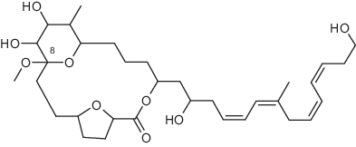 Type: Linear polyketides dibranched. C42H72O16 Oil, [α]D23 = −59° (c = 0.6, CHCl3). Source: Cyanobacterium Lyngbya bouillonii (Pigeon I., Papua New Guinea). Pharm: Molluscacidal (snail vector Biomphalaria glabrata, LC50 = 1.2 μmol/L, very potent; molluscacides play a critical role in control of schistosomiasis transmission); toxic (brine shrimp, LC50 = 10.8 μmol/L). Ref: H. Kim, et al, Org. Lett., 2010, 12, 2880│A. R. Pereira, et al, JNP, 2010, 73, 217