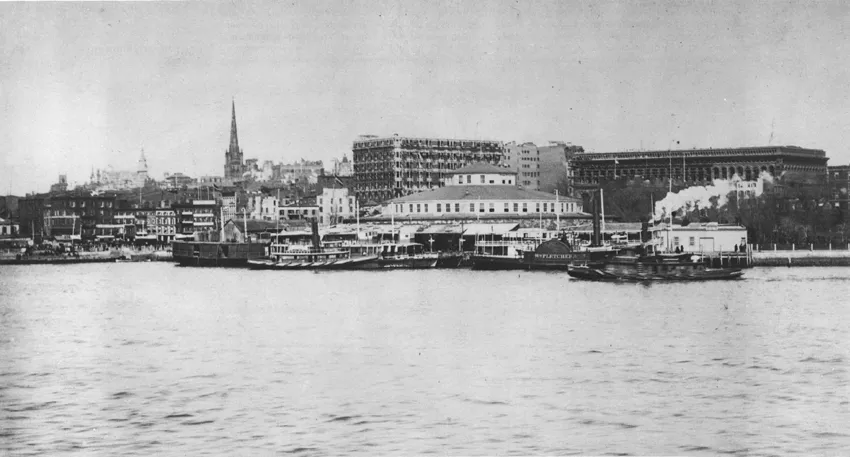 Visible in this late nineteenth-century photograph of the Manhattan skyline are (from left to right) the Western Union Telegraph Building, Trinity’s steeple, the Washington Building, Castle Garden, and the Produce Exchange. Castle Garden, earlier called Castle Clinton, was built c. 1807; from the 1820s to the 1850s it was an important theater and assembly hall; from 1855 to 1890 it was New York’s immigrant station; from 1896 to 1942 it housed the New York Aquarium. Today it resembles the fort as it was originally built. (The side-wheeler William Fletcher was out of Boston.)