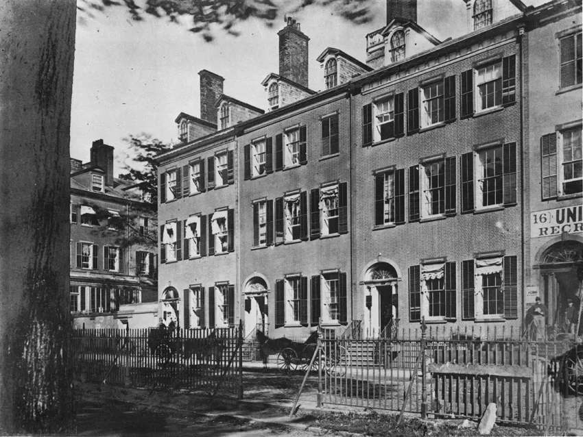 A row of fine Federal houses facing Battery Park—on the west side of State Street just south of Bowling Green—is captured in this photograph of the Civil War period. A recruiting office is set up on the ground floor at No. 16, where a poster at the door offers a bounty of $800 to each enlistee. The other buildings are also in use as military offices.