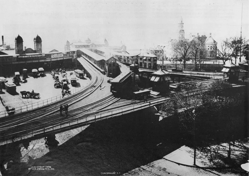 The dramatic sweep of the South Ferry Y, which was the southern terminal of the el, is seen from Whitehall Street in this copyrighted print dated 1894. The Coney Island Ferry (in the slip at far left) took passengers direct to Buffalo Bill’s Wild West Show. At the far right is the turreted splendor of the Barge Office.
