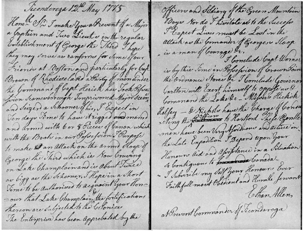 EVER since I arrived to a state of manhood, and acquainted myself with the general history of mankind, I have felt a sincere passion for liberty. The history of nations doomed to perpetual slavery, in consesequence of yielding up to tyrants their natural born liberties, I read with a sort of philosophical horror; so that the first systematical and bloody attempt at Lexington, to enslave America, thoroughly electrified my mind, and fully determined me to take part with my country: And while I was wishing for an opportunity to signalize myself in its behalf, directions were privately sent to me from the then colony (now state) of Connecticut, to raise the Green Mountain Boys; (and if possible) with them to surprise and take the fortress Ticonderoga. This enterprise I cheerfully undertook; and, after first guarding all the several passes that led thither, to cut off all intelligence between the garrison and the country, made a forced march from Bennington, and arrived at the lake opposite to Ticonderoga, on the evening of the ninth day of May, 1775, with two hundred and thirty valiant Green Mountain Boys; and it was with the utmost difficulty that I procured boats to cross the lake: However, I landed eighty-three men near the garrison, and sent the boats back for the rear guard commanded by col. Seth Warner; but the day began to dawn, and I found myself under a necessity to attack the fort, before the rear could cross the lake; and, as it was viewed hazardous, I harangued the officers and soldiers in the manner following; “Friends and fellow soldiers, you have, for a “number of years past, been a scourge and ter-“ror to arbitrary power. Your valour has been “famed abroad, and acknowledged, as appears “by the advice and orders to me (from the general assembly of Connecticut) to surprise and “take the garrison now before us. I now propose “to advance before you, and in person conduct “you through the wicket-gate; for we must this “morning either quit our pretensions to valour, “or possess ourselves of this fortress in a few min-”utes; and, in as much as it is a desperate attempt, “ (which none but the bravest of men dare under-”take) I do not urge it on any contrary to his “will. You that will undertake voluntarily, poise “your firelocks.”