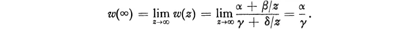 where α, β, γ, δ are complex numbers and z is a complex variable. The function w is defined on all of the complex sphere Z except z = −δ/γ and z = ∞. With the usual convention that w/0 = ∞ for u ≠0, we have