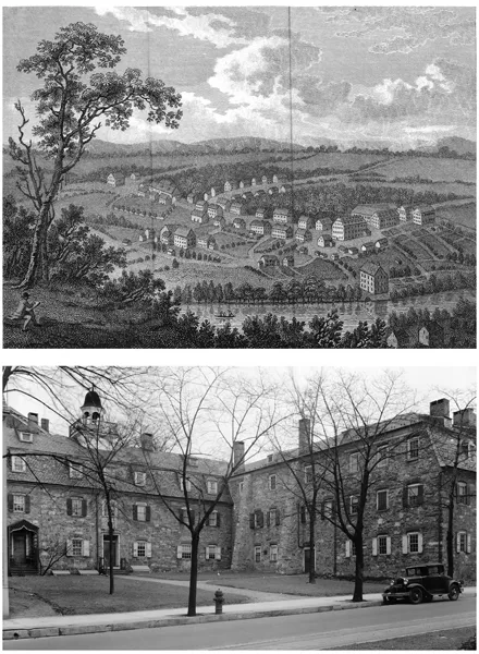 In this 1798 view looking north across the river at the Moravian settlement (top), the South Side is mostly forest and farmland. The stone masonry architecture of the original Moravian buildings, which still stand in Bethlehemâs North Side downtown and have remained in continuous use, include the Bell House (1746) and Single Sistersâ House (1744) shown here in 1937 (bottom). (Isaac Weld, Travels Through the States of North America, vol. 2, 1800, Beinecke Rare Book and Manuscript Library, Yale University; Ian McLaughlin, 1937, Historic American Buildings Survey, Library of Congress.)