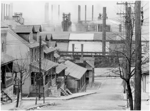 This 1935 photograph shows the close proximity of steelworkersâ housing to the plant down the hill, as well as its density. The smoke-filled sky contrasts with North Side images of the leafy Moravian settlement. (Walker Evans, âBethlehem Houses and Steel Mill,â 1935, FSA/OWI Collection, Library of Congress.)
