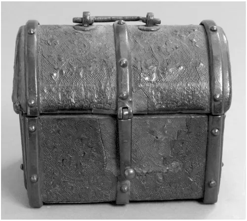 The door of the house then opens to reveal an arrangement of rooms: the entryway, the storeroom, the kitchen, the dining hall, the bed chambers, all depending on patterns of domestic architecture and the wealth of the family. Ranged inside each of the rooms are containers, often dozens of them. In the storeroom and kitchen, there are casks, chests, jars, and sacks; peering inside, you can find the staples of the Mediterranean diet: wine both red and white, vinegar, olive oil, salted fish or pork, wheat, flour, millet, rye, sorghum, beans of many types, lentils, nuts, and for the livestock, supplies of vetch, hay, oats, lupins, and straw.3 In the hall and the bedrooms, containers for storing food give way to boxes, chests, coffers, and caissons, identified with an expansive nomenclature that attests to the importance of the container, throughout Europe, both as metaphor and as practice (see Fig. 1.1).4 The chests sometimes contain little caskets, and as these are opened, they reveal their secrets.