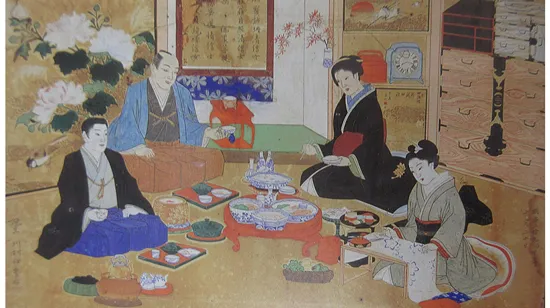 Four people, two men and two women, are seated in a Japanese-style tatami room with a decorative alcove (tokonoma 床の間) in the background (Figure 1.1). The main male figure, with hair tied in a topknot, occupies the seat of honor with sake cup in hand. The young woman in the lower right corner concentrates intently on her needlework. All figures are in full formal dress and a beautiful meal is laid out on the table, as if for a special day.