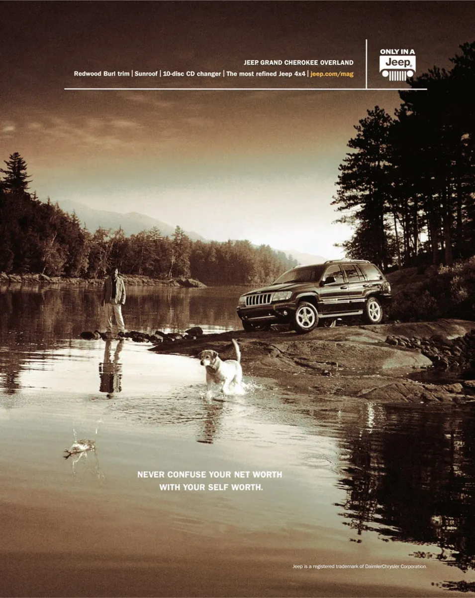 If you can say exactly what needs to be said in a few words, then do it. See how well it works in this advertisement that features a man and his dog in the woods. In this context, anything less than writing on the level of Ernest Hemingway would be a mistake. A good approach is to separate the details from the headline, so that the thoughtful tone, established by the headline, will not be disturbed by the details.