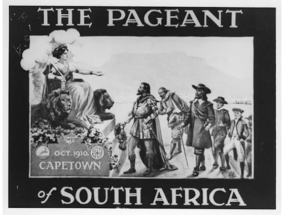 For the moment, the genealogy of performance and the productive friction of syncretic practices that link the Emancipation Celebration to the inauguration of 1994 call us to look at the 1934 response to the 1910 Pageant of Union, which unified British colonies and Boer republics at the expense of the black majority. While it commemorated emancipation, the Emancipation Centenary also reproached the Union for disenfranchising Africans and for the racialist ideology that shaped the Historical Pageant in 1910. This pageant, which began in Table Bay and continued before the Cape Town City Council, Parliament, and British dignitaries, employed five thousand performers. Borrowing its form from pageants staged in Canada and other British dominions (Merrington 1997), it depicted the European (Portuguese, Dutch, and British) “discovery” of the natives and the conquest of their lands but avoided the sensitive topic of the Anglo-Boer War (1899–1902). By ending with the meeting between King Moshoeshoe I and President Hoffmann of the Orange Free State in 1854 before the discovery of diamonds in 1867, the pageant elided the coercion that forced Africans to work in the diamond and later gold mines, and instead reenacted the imperial teleology of the “Progress of Prosperity” over “hordes of ignorance, cruelty, savagery, unbelief, war, pestilence, famine and their ilk” (Historical Sketch 1910: 93), whereby Europe brought “civilization” to what G.W.F. Hegel called the “unhistorical, undeveloped Spirit of Africa” (1956: 99). Despite this presumption, the pageant acknowledged the historical role of some people of color. In addition to Moshoeshoe who was played by his son, the pageant featured an actor playing Sheik Yusuf, a Muslim cleric exiled by the VOC in 1696 and credited today with bringing Islam to the Cape. Yusuf was both slave-owner and anti-colonial rebel but the script identifies him merely as “a Javanese teacher” (Historical Sketch: 78). Although the pageant thus included a few black roles and mute “maidens in white” (94), the “historical heroes” (95) were white men (Figure 1.1).