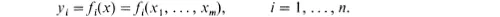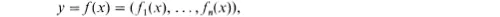 In general, suppose we are given the function f mapping a subset of Rm, Euclidean m-dimensional space, into Rn, Euclidean n-dimensional space. If x = (x1, . . . , xm) is in the domain of f, and we denote its image under f by y = (y1, . . . , yn), then we may write