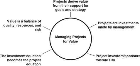 The traditional investment equation of “total return equals principal plus gain” is transformed into the project equation of “project value is delivered from resources committed and risks taken.” This equation is the project manager’s “math.” Many persons use the terms “benefits,” “return,” and “value” somewhat interchangeably even though they have different meanings.