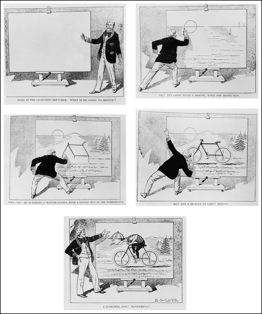 However, in terms of the conventions or iconography of animation during its early period (1908â1913), the vaudeville lightning sketch is perhaps the most important influence. This popular act on the vaudeville stage featured a quick-draw artist who, with a few careful and choreographed strokes of his crayon on a white board, could effect the most startling and amusing transformations of objects and caricatures. A drawing might start out as a sunset, then become a house on a lake, and with a few extra quick strokes turn into a young boy on a bicycle (fig. 1.1). What would this stage act have in common with early animation? First, in a purely practical sense, the quick and sure drawing skills necessary for this act would translate well to the requirements for making an animated cartoonâand two of the most adept lightning sketchers, James Stuart Blackton and Winsor McCay, would become the pioneers of American animation. Second, the convention of instant transformation of objects into something else would become a standard convention in animation as well. Metamorphosis is perhaps the single most important convention of drawn animation; it starts with this practice in lightning sketches. Third, the stage presence of the lightning sketcher translated into early animation as the convention of self-figuration: over and over again in animation, we find âthe hand of the artist,â as Donald Crafton calls this familiar iconography.6 That is, in early animation, it is common to see the animator begin to draw the figures before the figures come to life. The lightning sketch, Crafton claims, was âthe mechanism by which self-figuration first occurred.â7 Fourth, early animators often adopted the conventions of the stage in other ways, especially in choosing to present animation as an illusion or magic. Film could indeed bring objects and drawings to life, it seemed, and the urge to present oneself as a conjurer was irresistible. Animator as magician was one of the major tropes of the early period, at least partially owing to the stage practices of lightning sketchers.8 A film such as Blacktonâs Humorous Phases of Funny Faces (1906) exemplifies these practices in the way it presents its animation as a stage illusion, its sudden transformation of the faces, and its presentation of the artist as the creative force behind this startling metamorphosis. So the conventions, iconography, and practices of trick films, comic strips, vaudeville, and lightning sketches all contributed to the shape of early animation, which we will explore further in the next section.