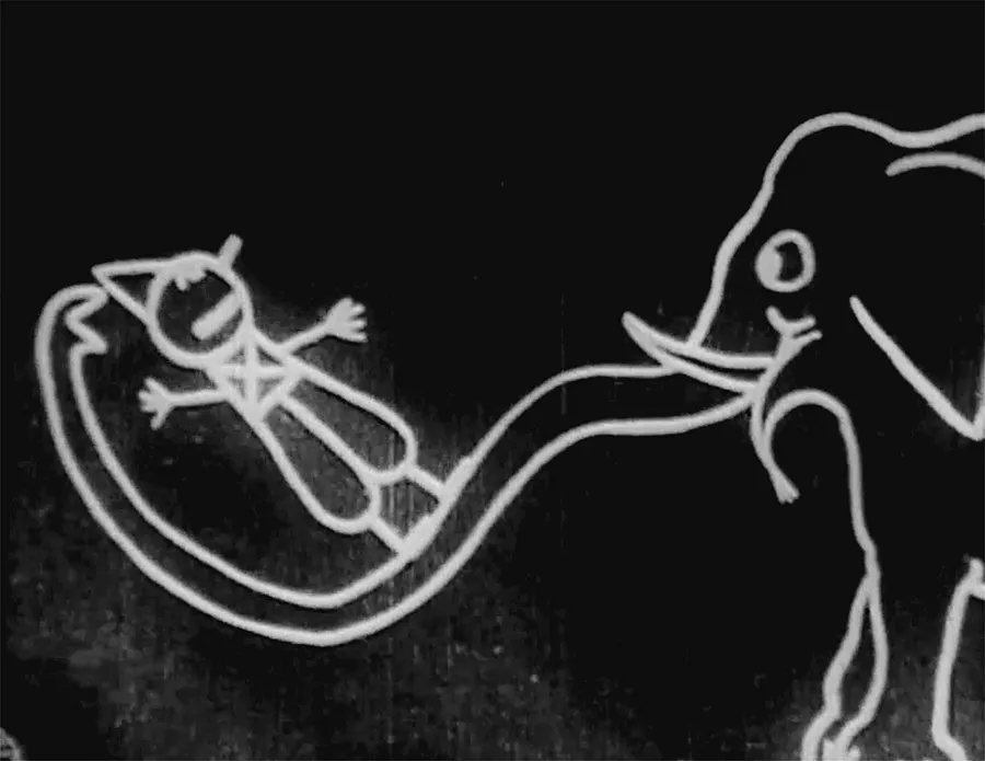 Cohl made films in the artisanal mode throughout his career: between 1908 and 1921, Cohl animated more than 250 films, which he designed, animated, and photographed single-handedly.11 Fantasmagorie was the first of these handcrafted gems. Its white lines on a black backgroundâaccomplished by drawing black lines on white paper, exposing the film, and then printing the film in negativeâare perhaps an homage to Blacktonâs Humorous Phases of Funny Faces, which used a black chalkboard for its images (fig. 1.2). To extend this homage, Fantasmagorie begins with the image of the animatorâs hand drawing the protagonist; the hand of the artist leaves the frame, and the drawing comes to life. Blacktonâs lightning-sketch performance has now been figured into the film properâa trope that would last for decades in one form or another; the âhand of the artistâ trope is probably the most common convention of early animation. The film is just over a minute longâthirty-six meters in lengthâand Cohl claimed it required 1,872 drawings, which is the equivalent number of frames in thirty-six meters of film. But close analysis shows that it required only 700 separate drawings, which he traced and retraced on a light box.12 The difference is in the number of frames he exposed per drawing. If he had exposed one image per frame, then he would have required that many separate drawings. But Cohl decided to expose two frames of film per image, thereby cutting his work in half.13 This shortcut, now called shooting on twos (or âon threesâ or âon fours,â depending on how many frames are exposed per drawn image), is common practice for animators hoping to cut the number of images generated; rather than sixteen drawings per second (a common projection speed in the silent era), for example, Cohl needed only eight drawings if shooting on twos.