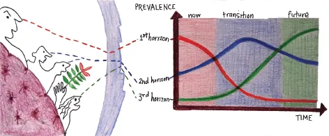 We can represent these three relationships of the present to the future as three horizons which describe a pattern of change over time in our area of interest, as shown in the picture at the beginning of this section.