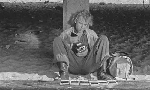 Like most, I cannot help but greet any film at its start with the question of what it is about. Wenders’s answer in this case is remarkable for its combination of leisureliness and concision. Right out of the gate, Alice rolls along at an unhurried, even pace that lasts until its close. The film is evidently about this kind of time, one that signals that spectacular swerves and explosions of passion are probably not on the horizon. To borrow David Bordwell’s useful term, Wenders starts, and stays, on a “dedramatizing” rhythm that propels us gently forward and hypnotizes us into watching even when nothing much seems to be happening.3 This does not mean, however, that the time of the film is devoid of emotion, or even, as we shall see, of unforced, non-histrionic drama. The musical theme and the lone jet give the opening a melancholy air and the filmmaker quickly and succinctly roots that feeling in who the film is about. Phillip is in a condition that resembles flight. His behavior on the beach introduces us to the elements of his predicament. He looks at the world from a place of solitude. Rather than missing, and searching for, the company of other people, however, he is focused on his problematic relationship to the very world itself. That relationship has something to do with the fact that his photos of things do not capture reality. More generally, any image of a time and a place, such as that imagined in a song, appears deceptive. This gap between the world and his pictures of the world drives him to redouble his photographic attempts to o vercome it. “It just never shows what you saw!” he complains obsessively a few scenes later, glancing down at yet another one of his pictures while on the road.